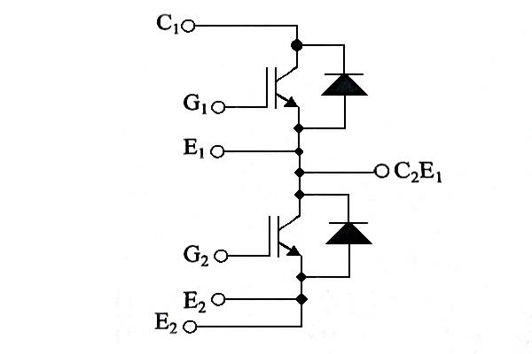 圖3是半橋模塊的內部等效。各種的生產廠家的接線端子名稱也各有不同,如C2E1可能會標識為E1C2,有的模塊只在等效電路圖上標識引腳編號等。