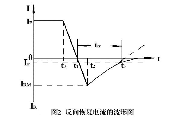 圖是反向恢復電流的波形圖。圖中IF為正向電流,IRM為最大反向恢復電流,Irr為反向恢復電流,通常規定Irr=0.1IRM。當t≤t0時,正向電流I=IF。當t>t0時,由于整流管上的正向電壓突然變成反向電壓,因此,正向電流迅速減小,在t=t1時刻,I=0。然后整流管上的反向電流IR逐漸增大;在t=t2時刻達到最大反向恢復電流IRM值。此后受正向電壓的作用,反向電流逐漸減小,并且在t=t3時刻達到規定值Irr。從t2到t3的反向恢復過程與電容器放電過程有相似之處。由t1到t3的時間間隔即為反向恢復時間trr。圖是反向恢復電流的波形圖。圖中IF為正方向電流,IRM為最大反向恢復電流,Irr為反向恢復電流,一般規定Irr=0.1IRM。當t≤t0時,正方向電流I=IF。當t>t0時,因為整流管上的正方向電壓一下子轉變成反方向電壓,所以,正方向電流快速減小,在t=t1時刻,I=0。隨后整流管上的反方向電流IR慢慢增加;在t=t2時到達最大反向恢復電流IRM值。之后受正方向電壓的作用,反方向電流慢慢減小,并且在t=t3時到達規定值Irr。從t2到t3的反向恢復過程與電容器放電過程有相似點。由t1到t3的間隔時間即是反向恢復時長trr。
