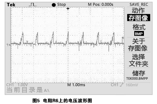 圖4為圖3波型的局部展開圖,或者也可以算是瞬時(shí)往功率線路充電要供應(yīng)的額外電流值:正常值為往電容C3的充電電流(相應(yīng)圖3中的類正弦波局部),額外值為往負(fù)載供應(yīng)做功的電流量(相應(yīng)圖3中的疊加在類正弦波上的紋波局部)。圖4中的時(shí)間段相應(yīng)于晶閘管的斷開轉(zhuǎn)向?qū)ā⒊潆姡?fù)載電流量均流經(jīng)電阻值R5、R6的過渡期間。因?yàn)楣β示€路的PWM操控周期為6kHz,PWM開通時(shí),電流量流經(jīng)R6,因此有觸發(fā)脈沖加到晶閘管的C、K極,PWM斷開時(shí),無電流量流經(jīng)R6,因此無觸發(fā)脈沖加到晶閘管的G、K極,因此 此時(shí)段內(nèi)晶閘管的觸發(fā)脈沖頻率也是6kHz。