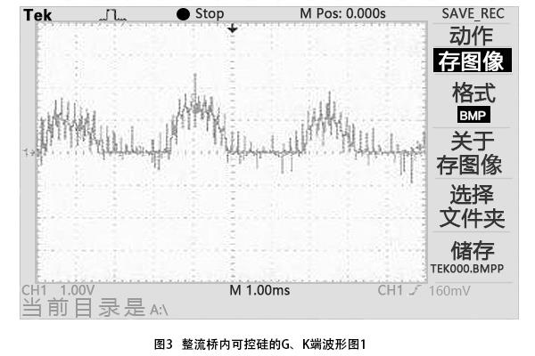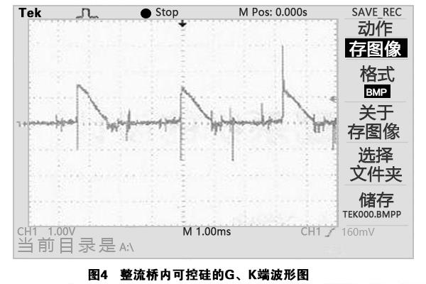 ③在送出的KZi信號(hào)為低,延時(shí)約10ms后(目地:全面確保觸發(fā)線路準(zhǔn)備好),允許功率線路C3帶負(fù)載。這時(shí),倘若C3電容兩端電壓比整流出的工作電壓(即圖2中的0端對(duì)2腳端的工作電壓)高,則整流橋內(nèi)裝的晶閘管仍不導(dǎo)通,僅有在下個(gè)充電周期:當(dāng)0端的工作電壓比1端的工作電壓高、且采樣電阻值R6上的電壓降足以讓整流橋內(nèi)裝的晶閘管導(dǎo)通時(shí),晶閘管才會(huì)導(dǎo)通。由圖2功率線路帶電機(jī)負(fù)載(負(fù)載功率約為5KW)后測得的晶閘管操控極(6、7端)實(shí)際波型如圖3、圖4所示。
