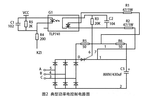 圖上A、B、C為3φ380VAC的輸入端,KZi為整流橋內(nèi)裝晶閘管的操控輸入端,R5、R6為功率線路的緩上電電阻值,與此同時(shí)R6也是TLP741光耦的電源采樣電阻值。